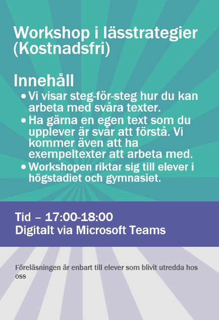 Vill du bli bättre på att förstå svåra texter i skolan? Under denna workshop lär vi ut strategier som hjälper dig att arbeta mer effektivt med kurslitteratur.